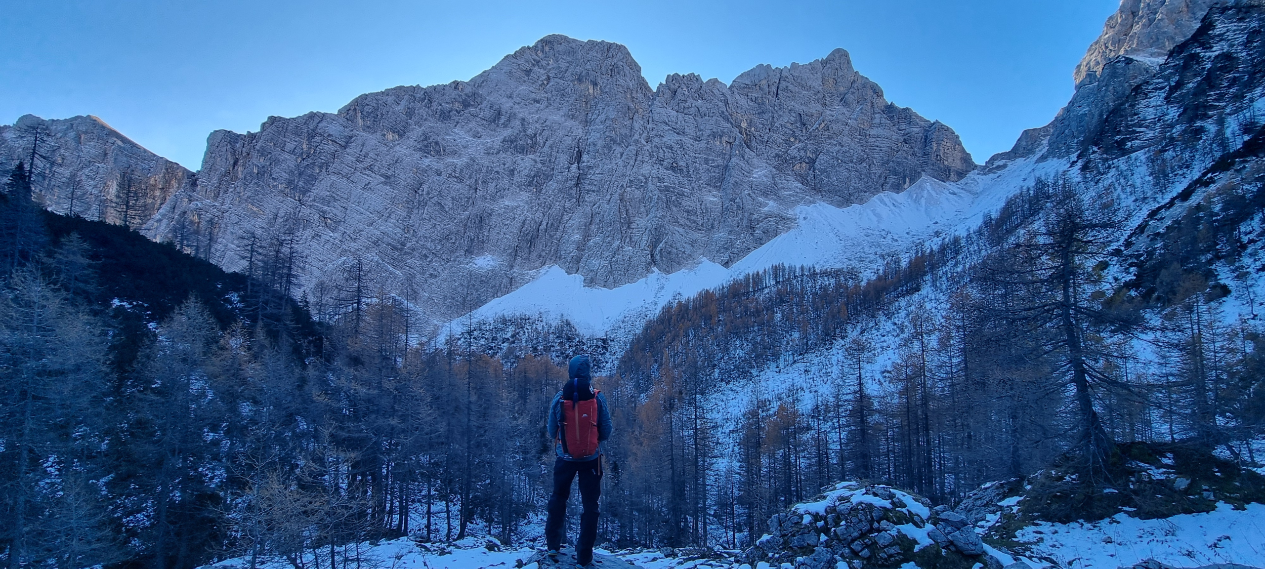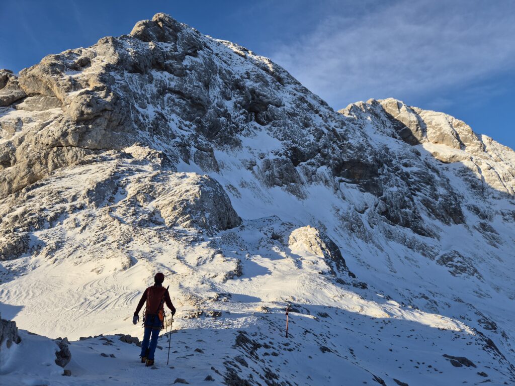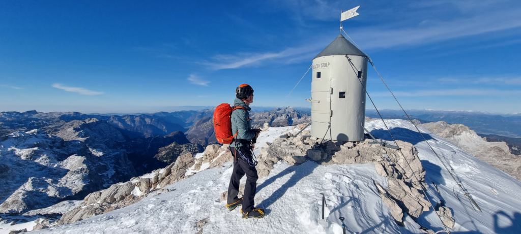 The snow is firm with a hard icy crust following a sharp overnight frost, not a breath of wind. As we start our ascent, we find a mix of steel pegs, pitons and cables secured to the rock, some completely covered by the snow and some visible, we make use of our lanyards to protect any steep, exposed sections as necessary on our ascent. It’s a fab route up to the summit, made more interesting by the snowy conditions underfoot. In a little under two hours we are stood at the summit, identified by the Aljaz Turret. We have the most stunning, panoramic view of the Julian, Kamnik – Savinja Alps and the Dolomites, we have the whole mountain to ourselves this morning, perfect timing or perfect planning, I can’t decide, I’m too busy enjoying the vista.