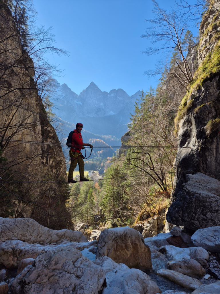 After a leisurely breakfast at our hostel, we pack for the overnighter on the mountain and head out in the afternoon when the sun hits the crags to tackle another via ferrata route at Ferrata Hvadnik, a ten-minute drive up the valley. The route described as a climbing route, 500m in length, graded **B/C through a wild gorge in the Gozd Martuljek, provides the opportunity to explore the geological limestone features of the Hvadnik river. As we start, we are quickly impressed with how the route has been secured to the rock, the crossing points across the river give a real adventurous feel, finally exiting after about two hours via the woods at the top of the gorge into a lovely alpine meadow overlooking the stunning snow-capped peaks of the Martuljek mountain range, a beautiful lunch spot. We finish the day exploring a local village further up the valley in the last of the sunlight before it finally dips behind the jagged peaks of the Martuljek range instantly dropping the temperature, a reminder of how cold it will be up on top.