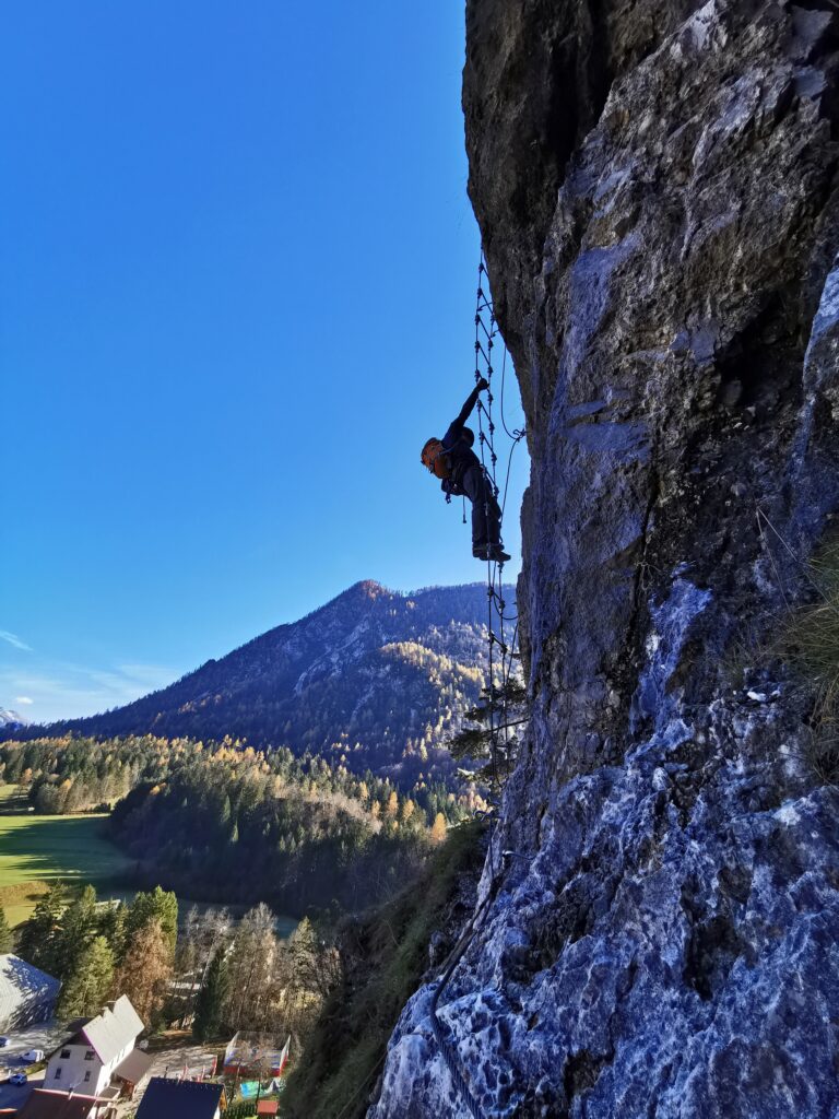 The route continues along the wall on the left side of the waterfall where there is an exposed traverse to the right, the most difficult part of the route and leading into the gorge above the waterfall. Another suspended bridge over the stream follows and the final part of the ferrata, which is a stiff pull up the vertical wall until finishing in the trees again, we sit here in the sun and enjoy the views across the valley for a short time before strolling down through the pine forest to finish. We both agree this was the best route of the week, back at the car we now head to Kranske Gora, a town further up the valley towards the Italian, Slovenia border to grab lunch. It’s not quite ski season here yet, but it’s clear the town is being prepared for the influx of skiers arriving over the coming weeks. We finish our day being tourists and first head to Lake Jasna renowned for its crystal-clear water, it’s bustling with folk out enjoying the scenic park, walking, biking, playing frisbee or having a picnic. Before heading back to our hostel to pack for the morning’s flight home, we take a detour and head up to Planica, the Nordic Ski jumping centre. It’s a major activity hub, open all year round offering accommodation along with ice skating, a zipline, indoor skydiving, disc golf, curling, cross country skiing school including six hundred metre underground skiing track. We’re happy to check out the four ski jumps and watch in amazement at the ski jumpers training, as they take it in turns to head down the steep ramp, take off and fly for what seems like ages before landing smoothly in balance. They are obviously well practiced, we can only imagine what it must feel like to go off the end of that ramp…